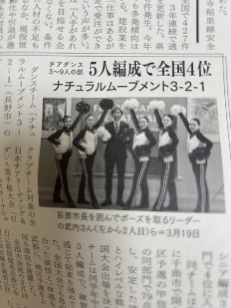 ゆうがたGet!と市民新聞 投稿日 2026年4月8日 更新日 2026年4月13日 著者 NM321 カテゴリー 出演情報 3月31日TSBゆうがたGet!にチアーA出演させていただきました♪♪3-2-1チアーやはり乗り越えた力には景色変わるご褒美!TVリハの様子、本番皆さんに見ていただいたのでリハまでの映像です。メンバーは緊張とテンション上がって周りの私達まで緊張でした。 引き続きチアーA情報。先日市長さんに表敬訪問させていただいた事市民新聞に!まぁご褒美がたくさん!ナチュラルムーブメント3-2-1境 じゅん子 この記事を書いた人 NM321 記事一覧